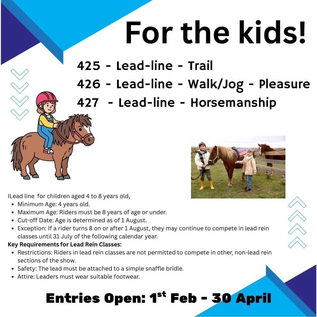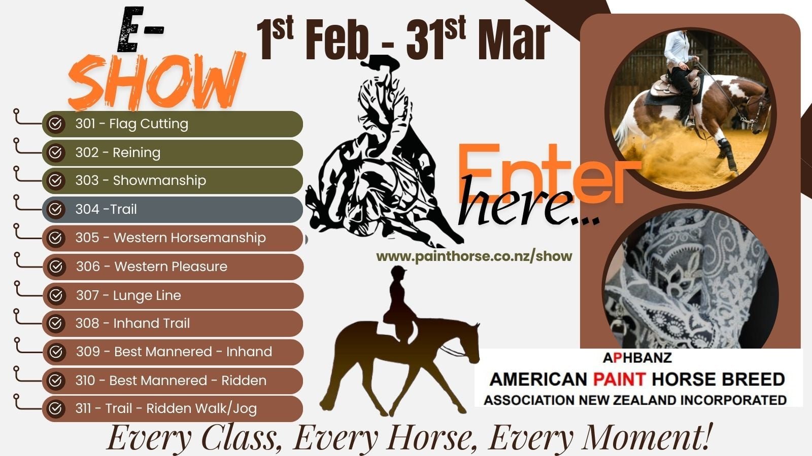 Patterns Below 101 Hunter under Saddle Walk/Jog 102 Hunt Seat Equitation Walk/Jog 104 Western Horsemanship Walk/Jog 106 Ranch Rail Pleasure Walk/Jog 105 Western Pleasure Walk/Jog 201 Hunter under Saddle 202 Hunt Seat Equitation 203 Hunter Hack 107/108 Best Paced 103 Showmanship Walk Only 206 RANCH CUTTING 205 RANCH COW WORK 207 RANCH RAIL PLEASURE 208 RANCH RIDING 209 RANCH REINING 210 RANCH TRAIL 204 DRESSAGE Patterns Below 305 Western Horsemanship 427 Leadline - Western Horsemanship Walk/Jog 302 REINING 312 Western Dressage 309/310 Best Mannered 306 Western Pleasure 426 Leadline - Western Pleasure Walk/Jog 311/425 TRAIL RIDDEN/leadline - WALK/JOG 308 INHAND TRAIL 307 LUNGE LINE 303 Showmanship 304 TRAIL 301 FLAG CUTTING Patterns Below 421/422 Liberty Inhand/Ridden 423 Bareback Halter Classes (Best Age & Sex, 419-420) Best Presented (Classes 401,405, 408,413 424 Freestyle (create your own)